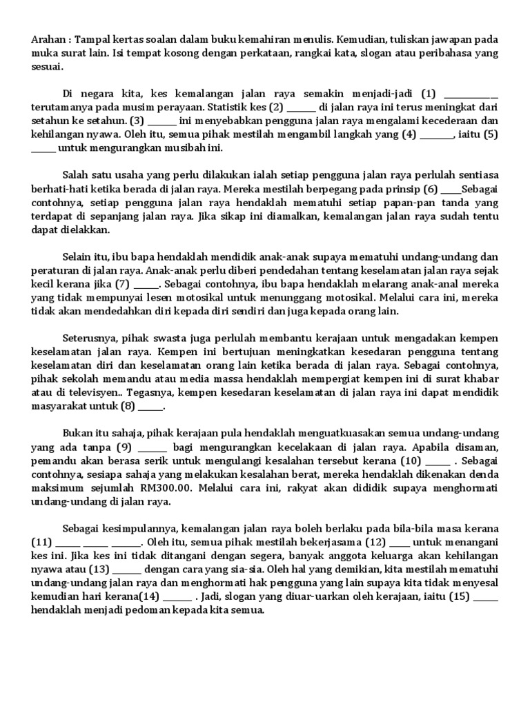 Langkah ini membolehkan jalan raya menampung bilangan kenderaan yang lebih banyak. Tulis satu karangan tentang usaha-usaha yang perlu diambil. Laman web ini menyediakan koleksi peribahasa Melayu yang sesuai untuk pelajar sekolah yang akan mengambil peperiksaan akhir tahun ujian upsr pt3 spm atau stpm di mata pelajaran Bahasa Malaysia.